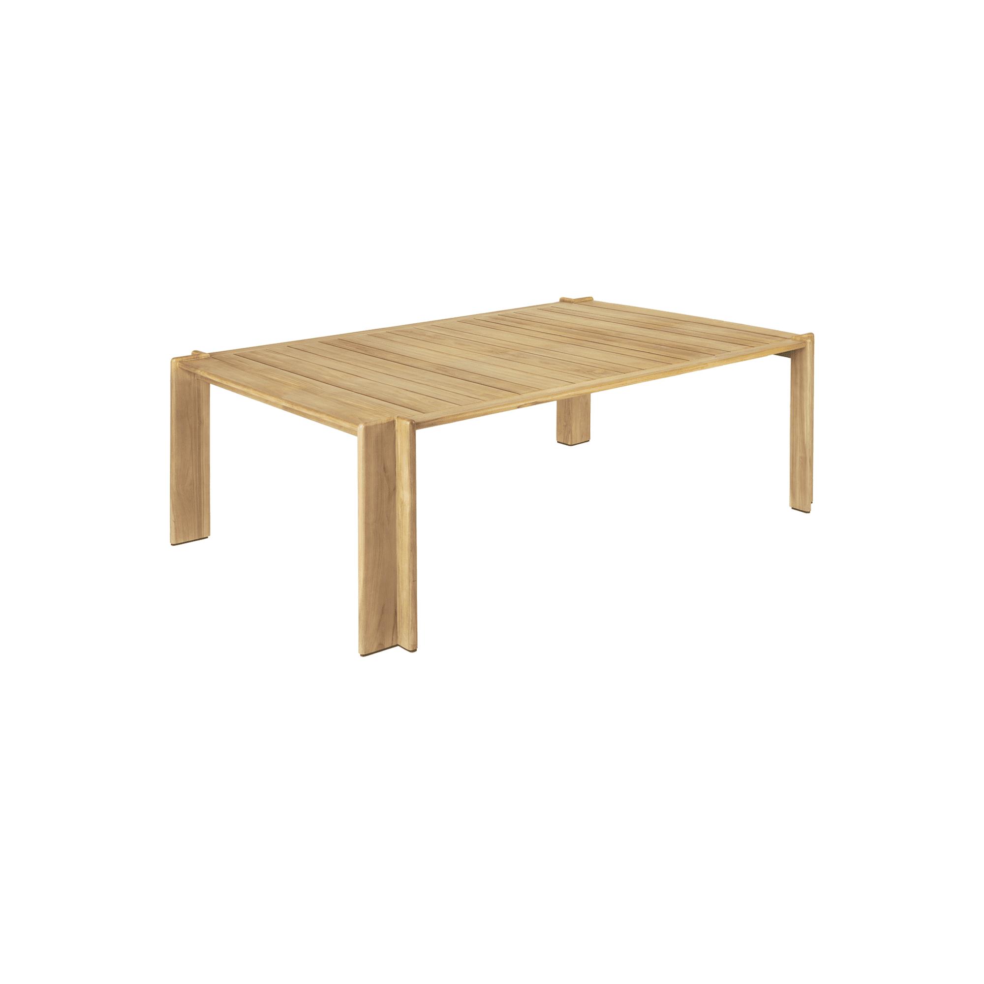 The tables’ simple aesthetics maintain an understated poise with a nod to classic references without being too formal. The tabletops are made from rhythmic, repeating slats of solid, premium teak, enclosed by a frame made from the same slats, giving a minimalist feel. The table legs are formed from two vertical slats, using a miter joint that creates an inverted ‘L-shape’ on each corner. Referencing architectural and maritime design, the unusual leg design provides both structural support and visual interest, giving the piece a certain lightness. Each leg protrudes slightly above the tabletop surface, culminating in a rounded detail in contrast to the geometric lines of the structure, that gives a calm composure to the design.