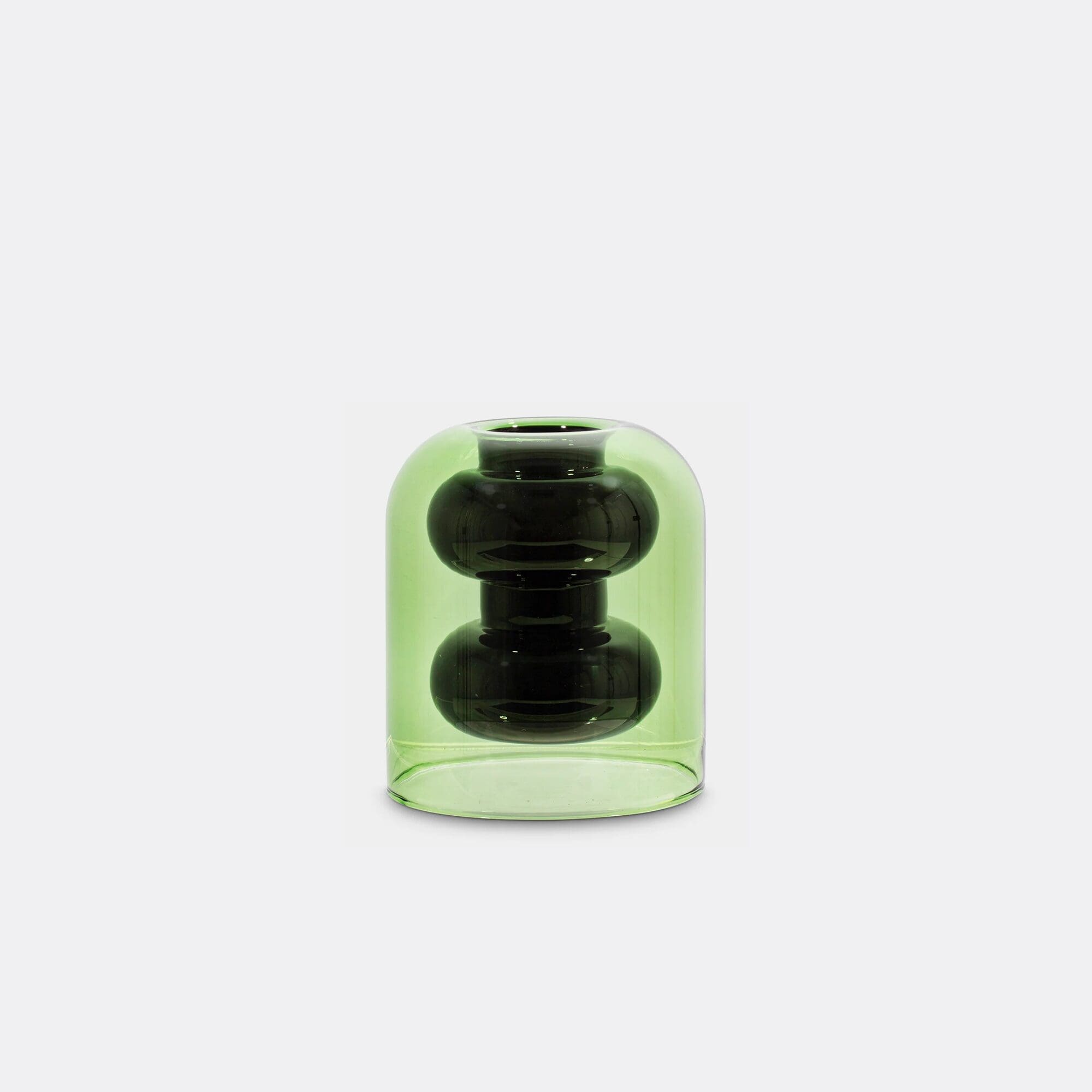 The Bump short vase is part of a minimalist borosilicate vessel family, handmade with subtle green and grey hues. Bump offers an elegant approach to the alchemical art of floral arrangements, perfect for both everyday use and special occasions.