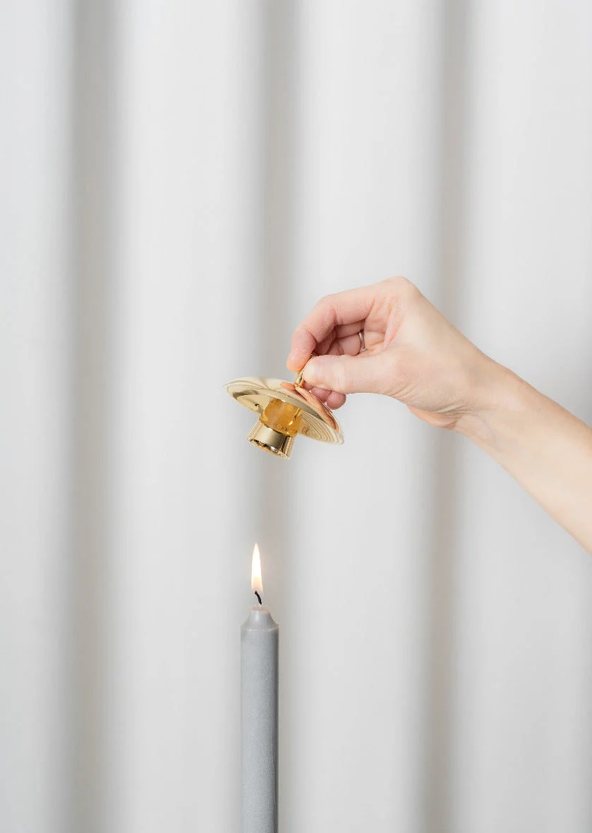 Flora is a candle extinguisher with a sculptural quality. When not in use, Flora can stand as an elegant solitaire and as a purely decorative object. The elements of its shape – handle, heat shield and the candle extinguisher itself mimic the parts of a lily – stem, petals and corona