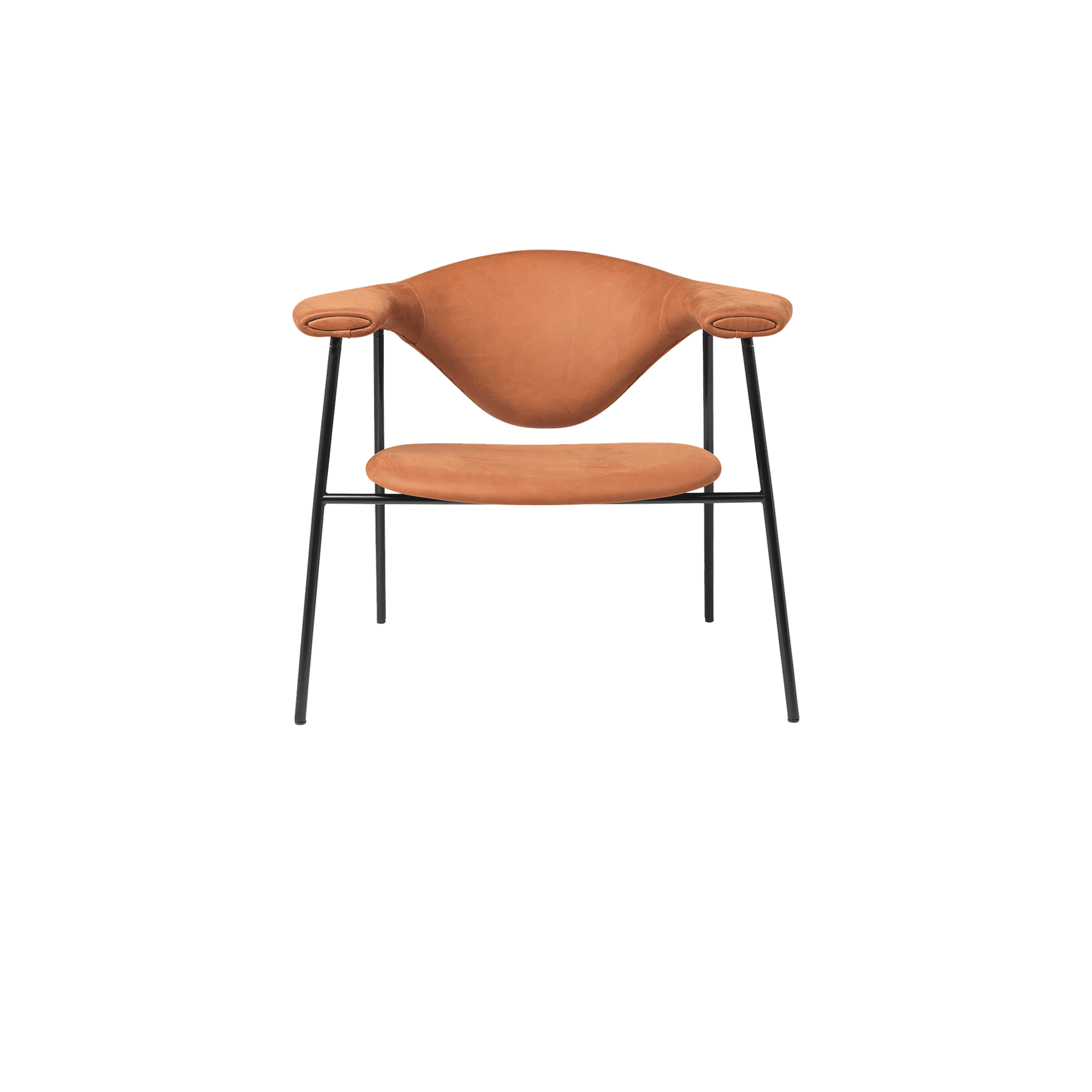 The characteristic Masculo Lounge Chair with a four-legged version in metal, giving the collection a domestic expression adapted to the hospitality market.Designed for the fine dining restaurant Copenhague at Maison du Danemark in Paris, the four-legged Masculo Chair and Lounge Chair in metal marry the idea of Danish elegance and simplicity with Italian refinement and playfulness. The backrest of Masculo is almost overly large and appears to float in the air which is challenging to the senses. This is supported by the slender metal legs that make the whole chair almost sculptural and exciting to the eye. The upholstered chair ensures a high level of comfort, while its clean metal legs and sophisticated form lend the chair a graceful presence. The metal base gives the chair a more domestic expression that is perfectly suited for hospitality projects as well as the private home.