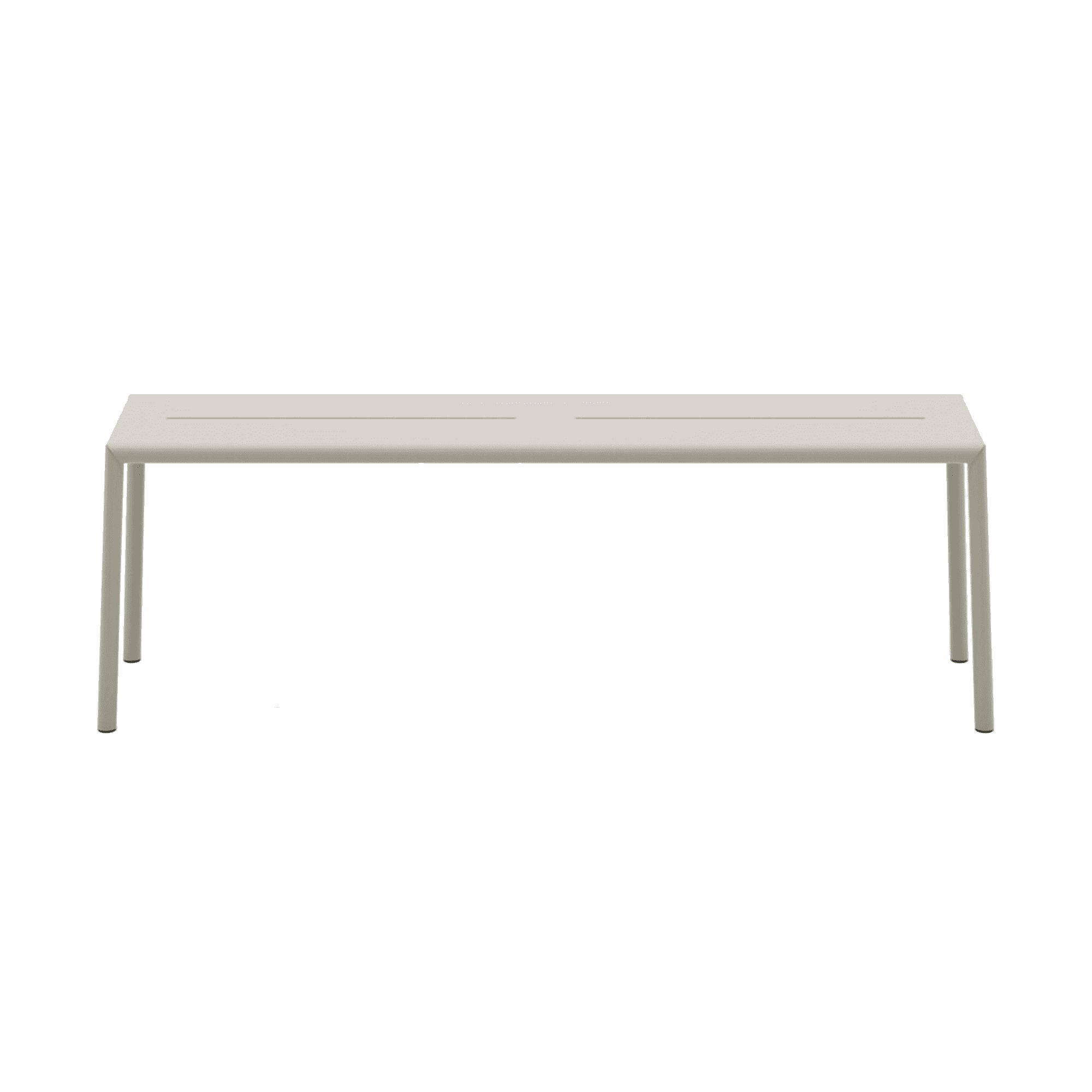 The understated, monochromatic appearance of the May family is detailed without being technical. The chair leads the way for the defining interactions of the design in which a delicate surface meets a bold frame – two opposing elements which somehow comfortably coexist. As the light steel sheet tightly wraps itself around the chunky steel frame, it forms a strong and comfortable seat, slightly curved so that it gently hugs the body. A slit through the seat allows for water drainage and adds a subtle detail to the otherwise uniform surface. Mirrored in the tables, it creates a repetition of lines that brings lightness, direction, and unity to the family.