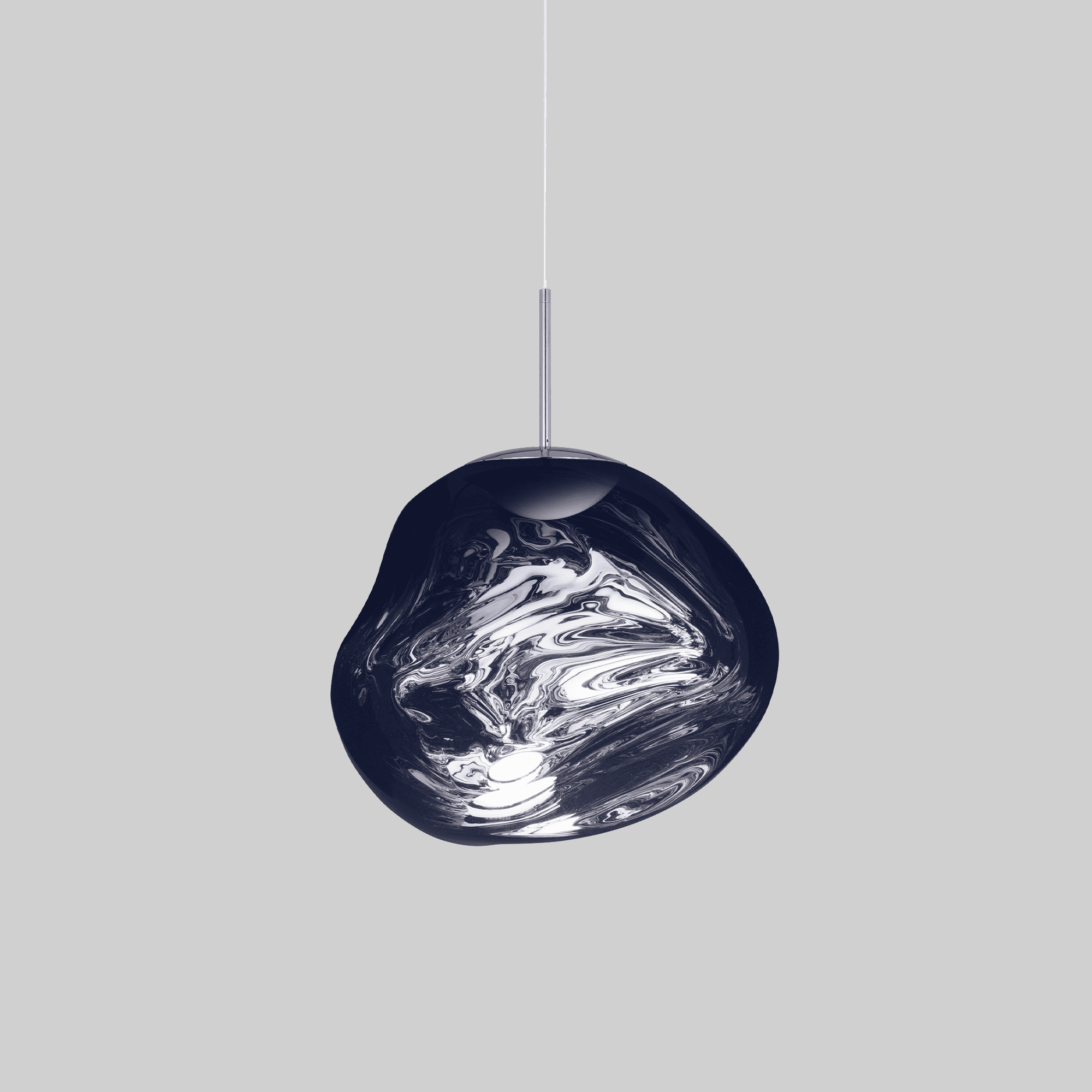 Melt is evocative of molten glass, the interior of a melting glacier or images of deep space. An imperfect, organic and naturalistic light that produces a mesmerizing hot-blown glass effect. Melt is created through a process of blow moulding and vacuum metallisation to achieve melted orbs with abundant and unusual luminosity. Here the orb sits on a cone-shaped base creating a striking silhouette.