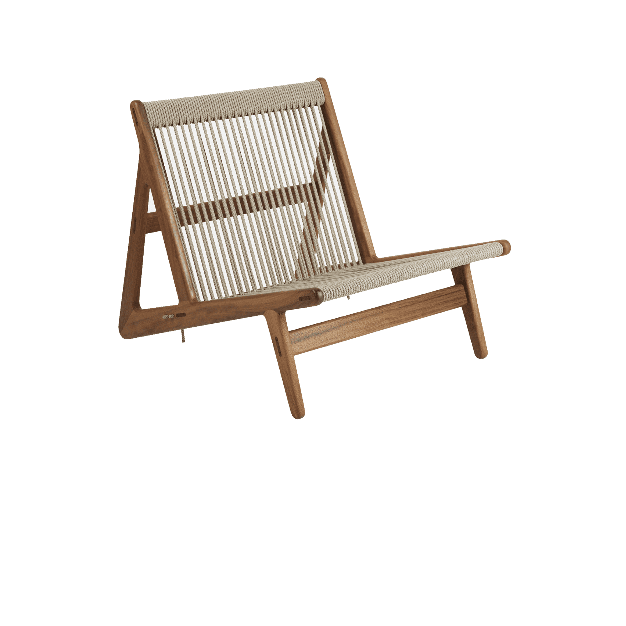 With its low-slung wooden frame and nautically evocative rope seat and backrest, Mathias Steen Rasmussen’s breakthrough MR01 Initial Lounge Chair has begged to be taken outside since its creation. Where the frame of the indoor edition is made from oak or walnut, the MR01 Initial Outdoor Lounge Chair is crafted from FSC-certified iroko. This wood has proved itself ideally suited to Rasmussen’s design, maintaining its strong silhouette through the transition outside, and helping to emphasize the MR01 Initial Chair’s sculptural quality.As with the indoor edition, the MR01 Initial Outdoor Lounge Chair’s frame is constructed without the use of screws. A gifted woodworker, Rasmussen developed the design using techniques from the artisanal discipline of cabinetmaking, with wedged mortise and tenon joints attaching the five cross bars to the open-triangle side pieces. This results in a geometric, materially honest, and structurally transparent form that demonstrates the craftsmanship of its making from every angle it is viewed from, and which creates an enchanting play of light and shadow as it sits in the sun.To endure life outdoors, the MR01’s Initial Outdoor Lounge Chair’s has custom-made high-performance polyester rope. This material is waterproof, making it perfect for the poolside; UV-resistant, so it will not fade over long days in the sunshine, which means it will not degrade. An anti-deformation core prevents the rope stretching over time.
