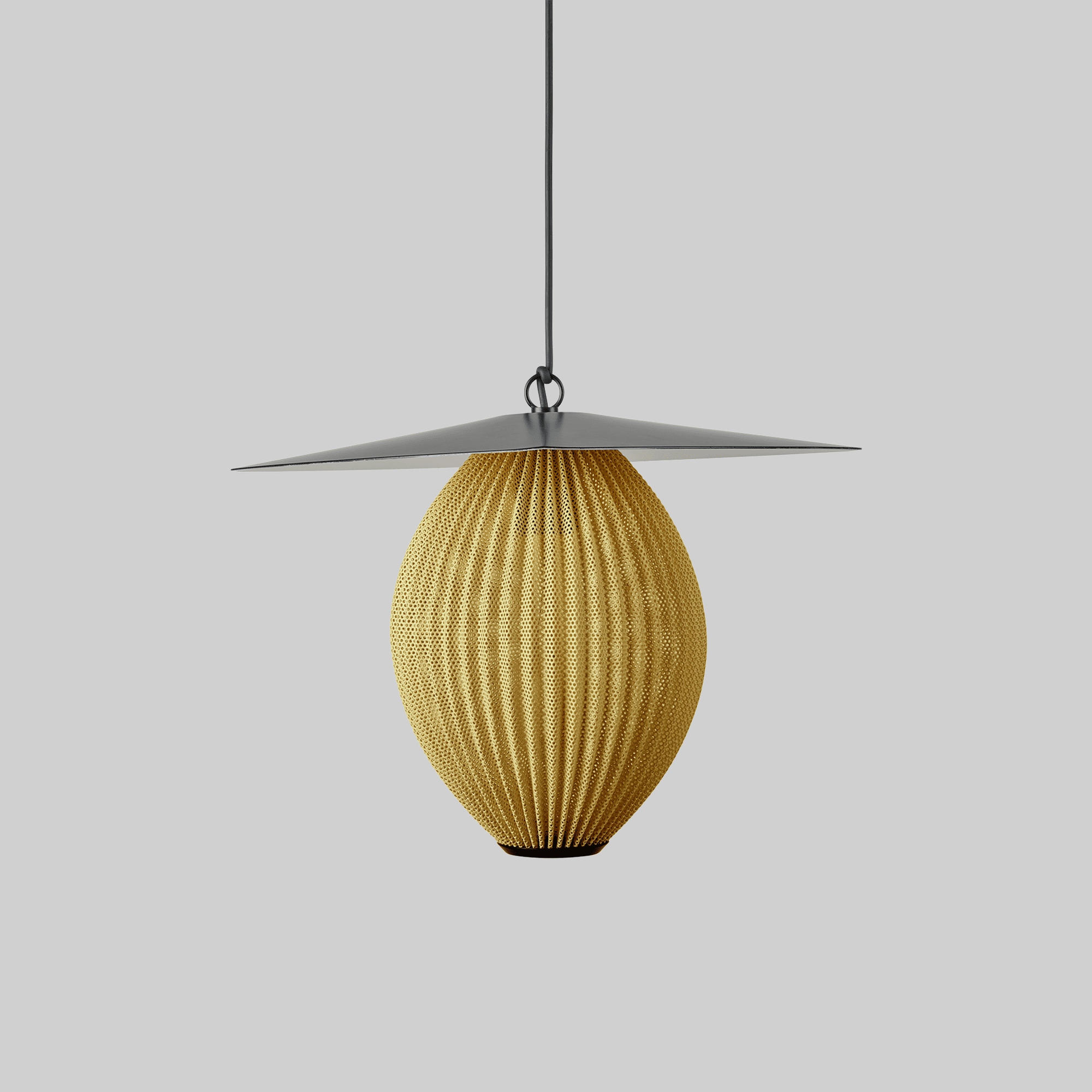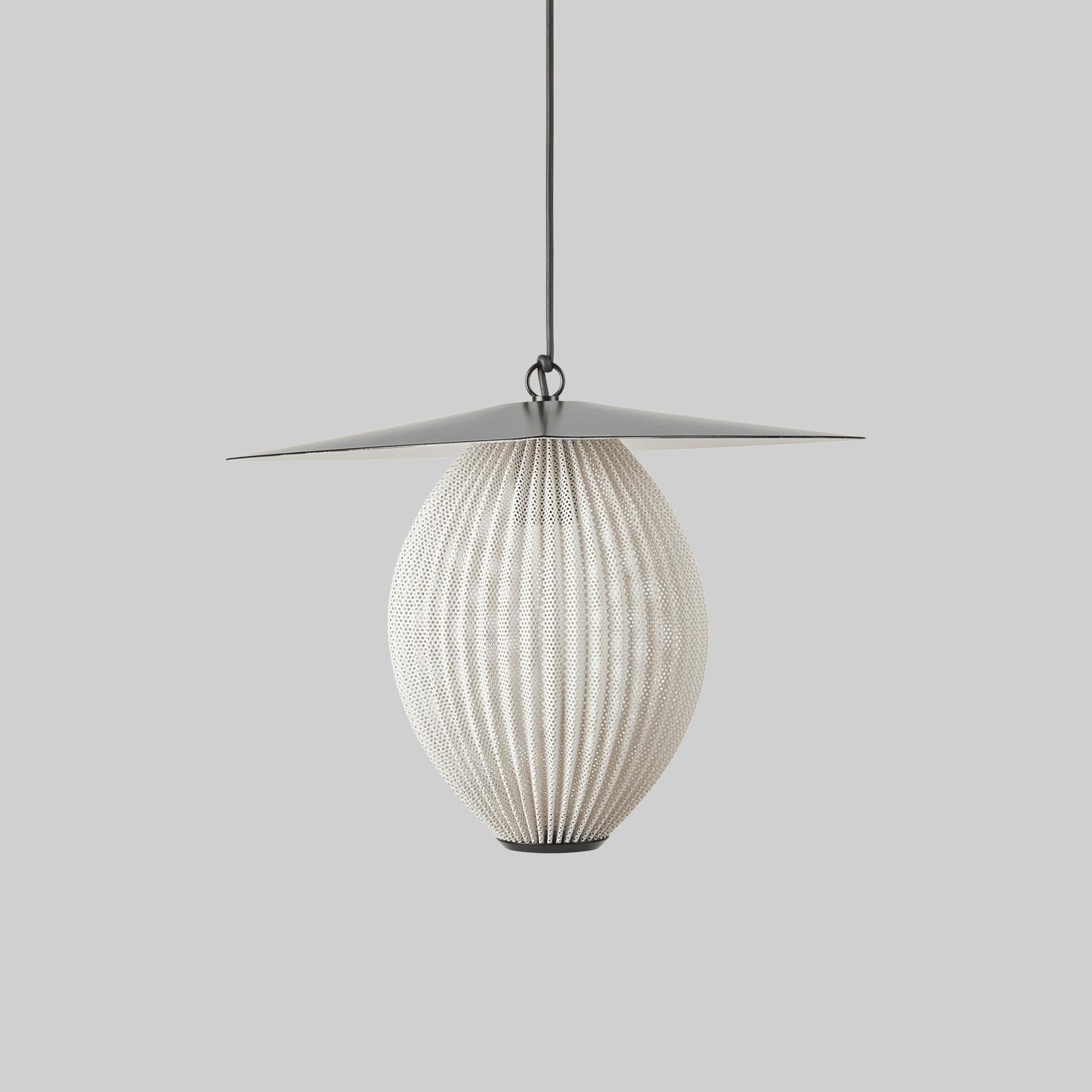 Building on the Satellite Collection of whimsical, modernist sculptural lamps, the Satellite Outdoor Pendant and Satellite Outdoor Floor Lamp are GUBI’s first lighting designs created specifically for outdoor use. Based on Mathieu Mategot’s original design concept from 1953, the designs feature an ovoid shade crafted from a perforated sheet of stainless steel, topped with an aluminum cap that helps direct the light. Playful and modern even 70 years after their first creation, both Satellite designs are ideal for installation on covered patios, verandas, or other sheltered dining areas. Two sizes of pendant are available, and both the pendants and the floor lamp are available with a semi-matt shade in either Cream White or Mustard Gold.