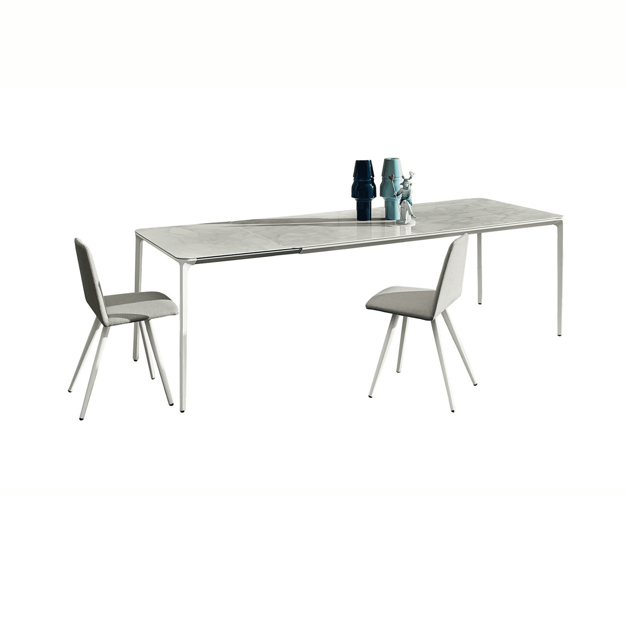 Dining table with die-cast aluminium legs, polished chrome finish or lacquered, various finishes, and anodized or lacquered, various finishes, aluminium structure profile. Tempered glass top, 8 mm th. lacquered or frosted lacquered, various colours. Top available also in MATERIA, ceramic, wood, or HPL, various finishes.