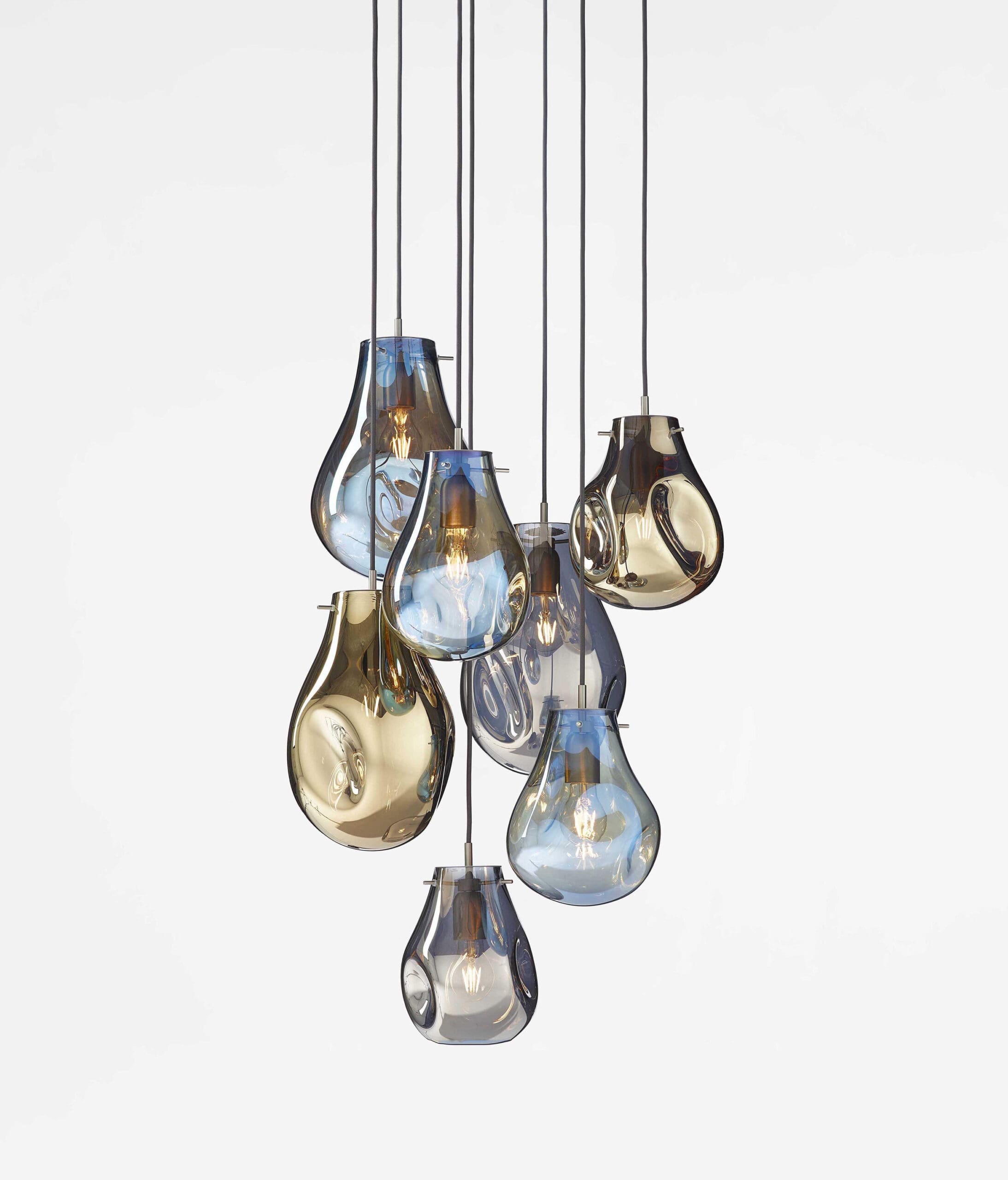 Varying colors, transparency and continuously changing shapes – the characteristic features of soap bubbles, inspired this collection. Lighted, their metallic sheen magically transforms to iridescent and translucent. Each piece is hand-blown without a mold, producing an original in both shape and color.