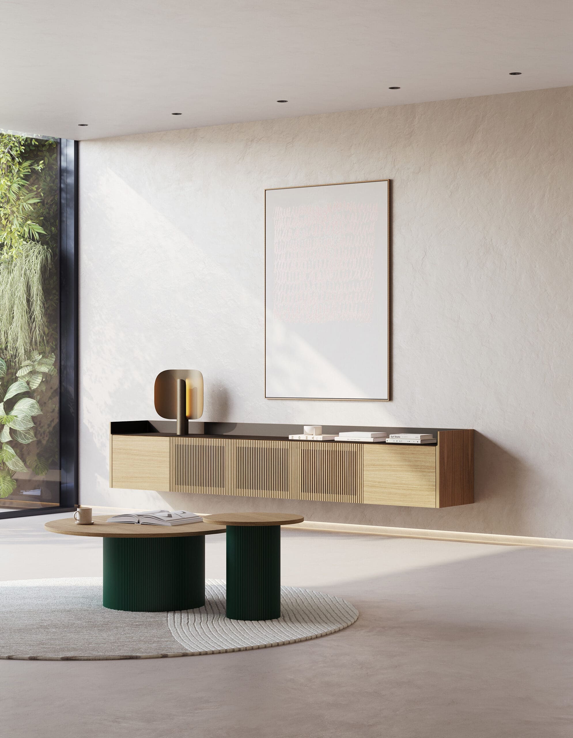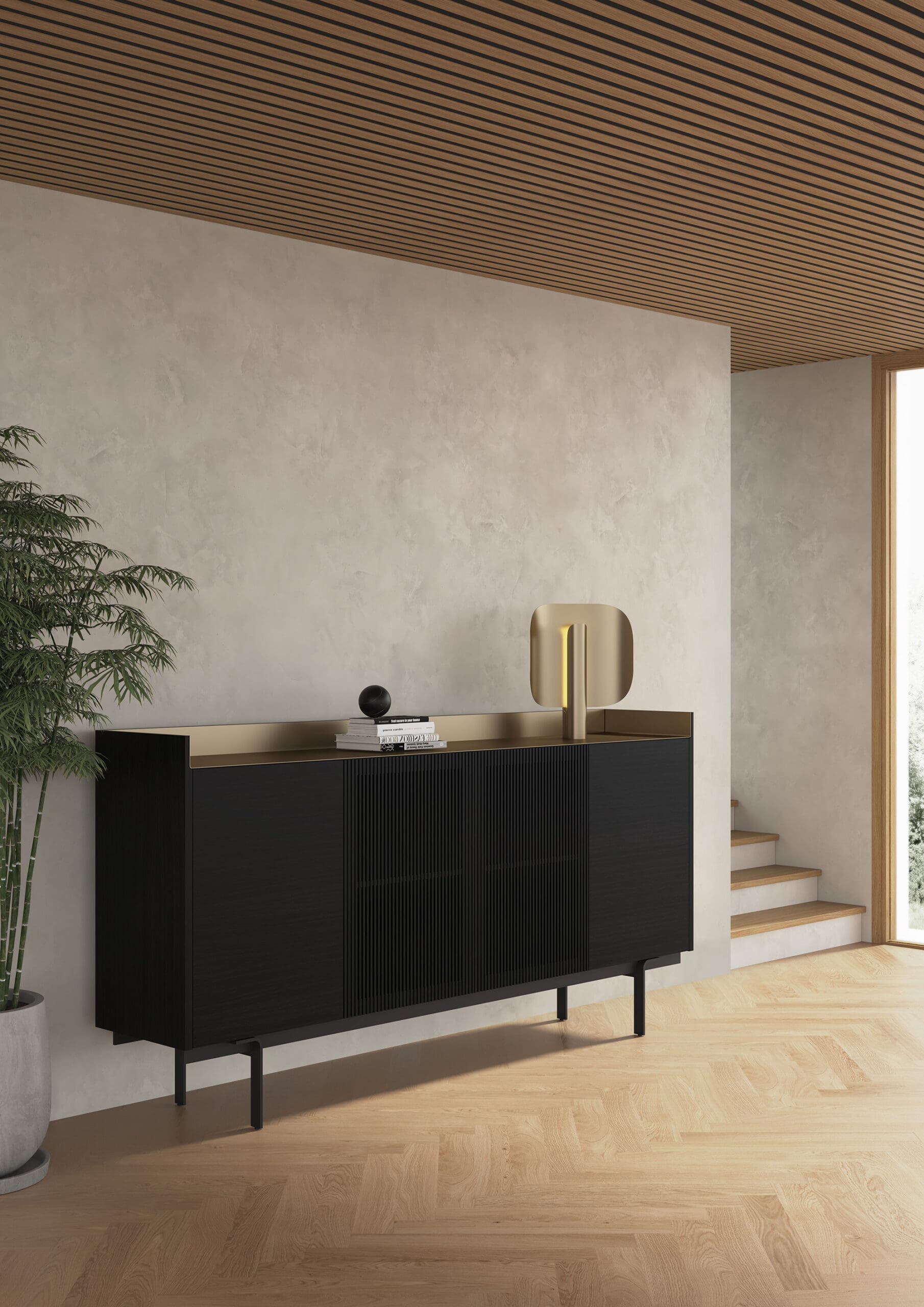 A collection of sideboards, chests of drawers and TV benches, winner of the Red Dot 2015 Award, with a singular aluminium finish on the top surface.