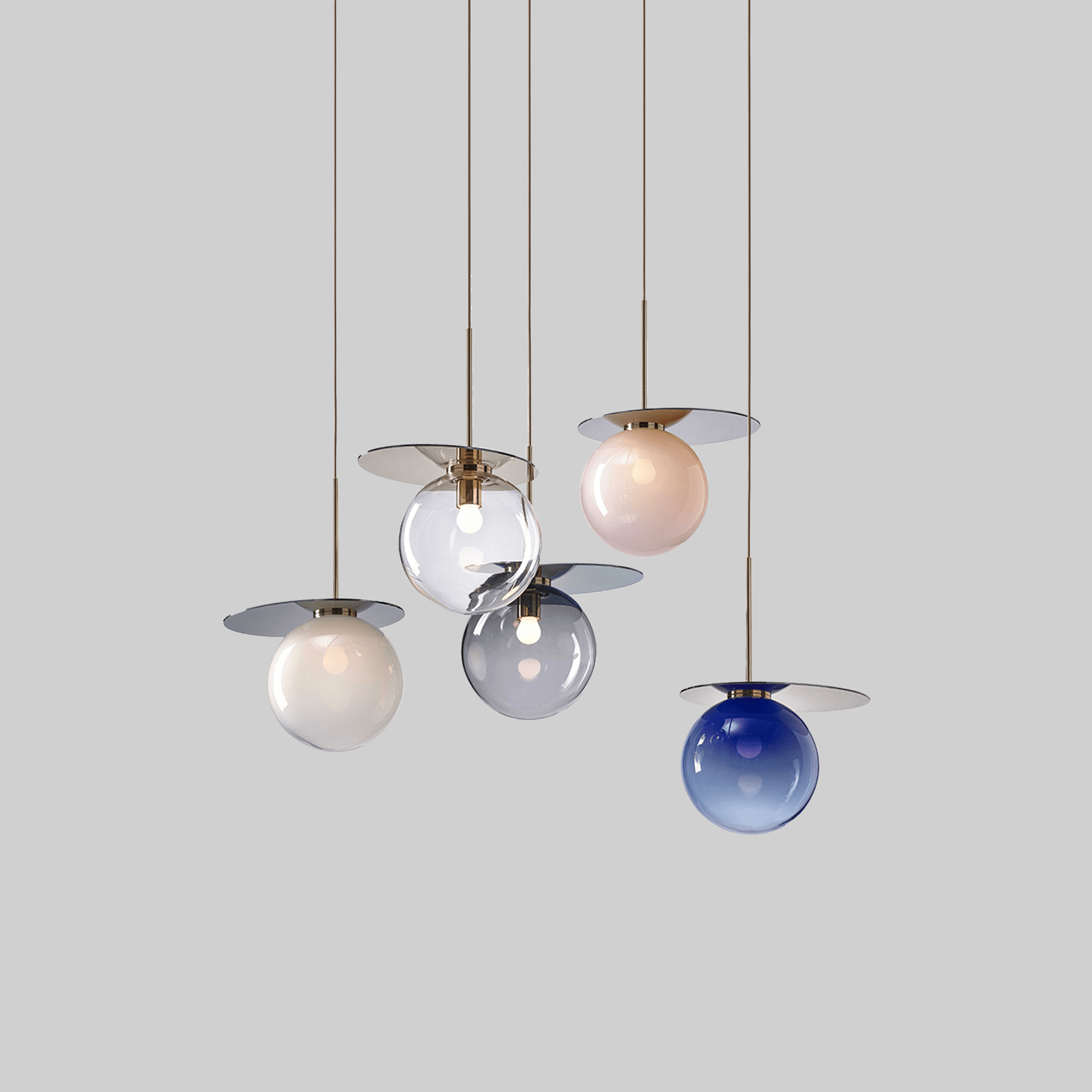 Inspired by the relationship between geometric objects and their shadows, the Umbra collection features elegant pendants in sophisticated detail. Its metal plate derives from the perfectly elliptical shadow cast by a side-lit ball, mirroring the colorful mouth-blown crystal piece.