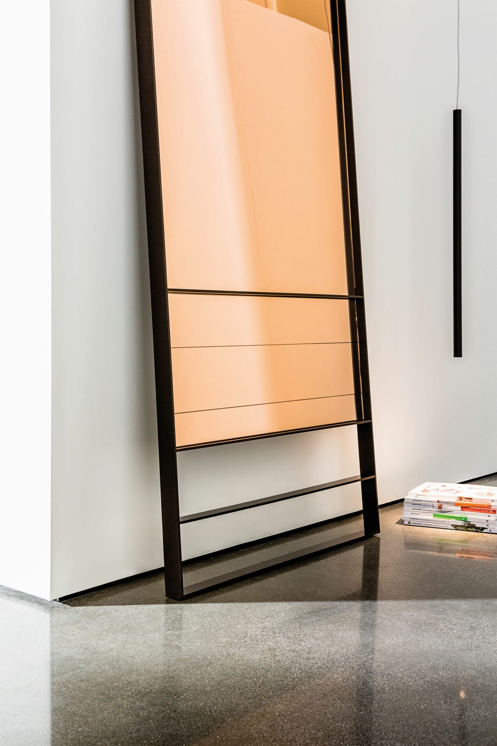 Floor or horizontal/vertical hanging rectangular metal framed mirror with lacquered metal frame, mocha or burnished brass finish. Central mirror available in different shades.