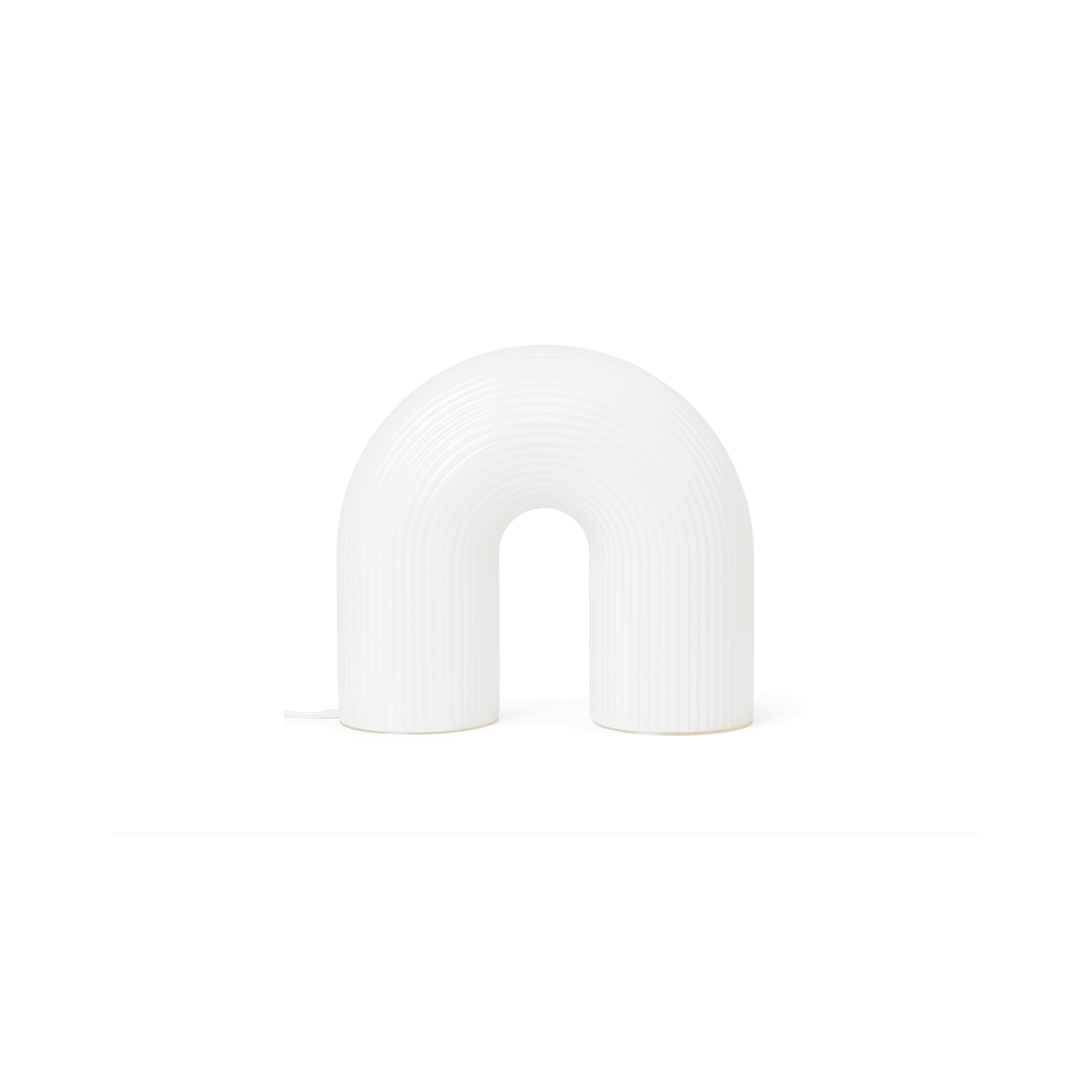 A bold light with a sculptural arc reminiscent of ancient columns, our Vuelta Floor Lamp is made from opal glass with a rippled surface that lends textural appeal to the piece. Featuring oversized dimensions, the artistic Vuelta Floor Lamp will serve as both a sculpture and lamp in your home. Designed with an LED light source that emits a soft, diffused light, it also features an adjustable dimmer switch for ultimate ambiance control.